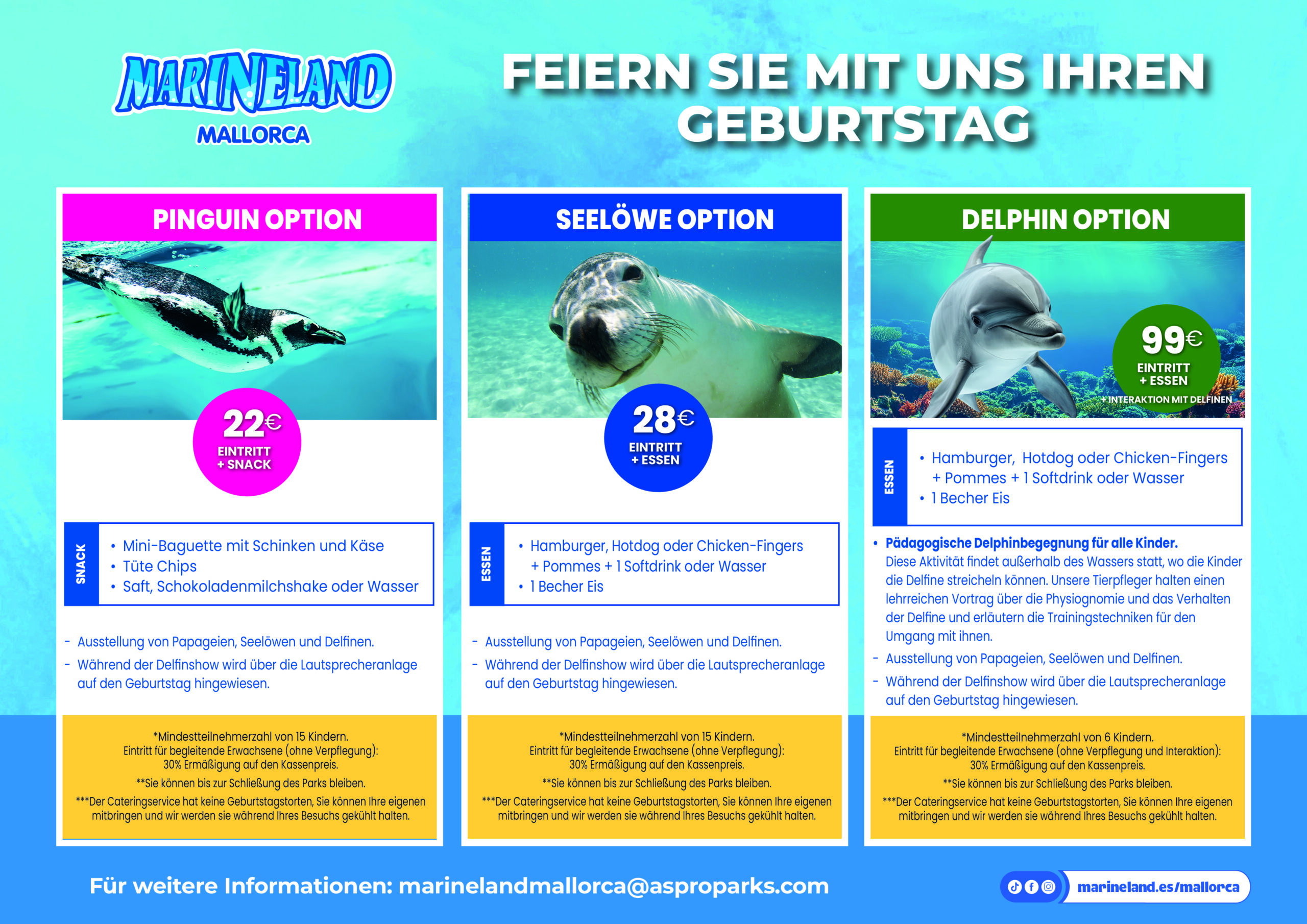 Für weitere Informationen in dieser Hinsicht und um ausführlichere und detailliertere Informationen einzusehen, senden Sie bitte eine E-Mail an Kontakt – Marineland Mallorca mit Angabe von: Datum des Besuchs und ungefähre Anzahl der Personen, Erwachsene und Kinder, aus denen die Gruppe besteht.