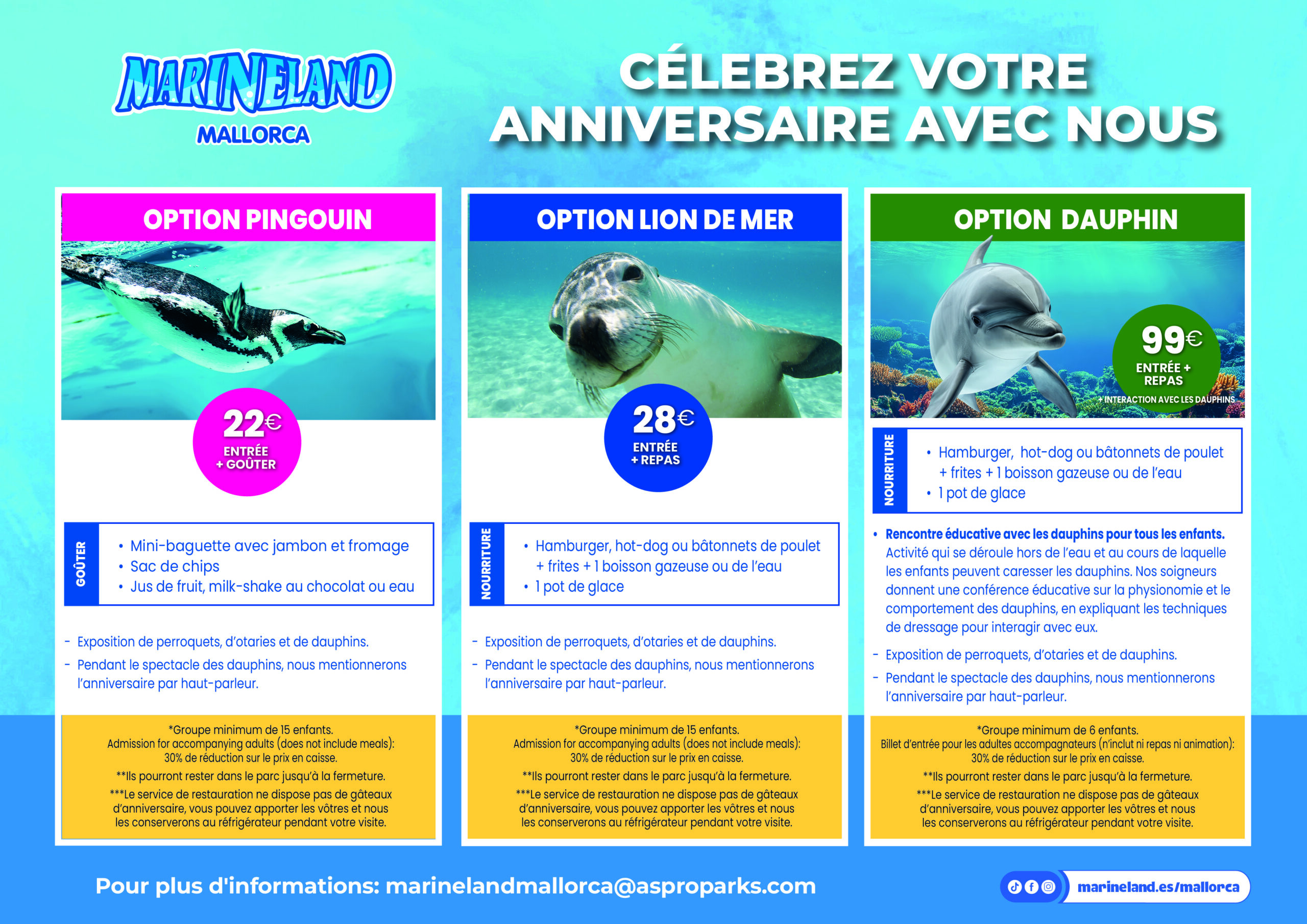 Pour plus d’informations à cet égard et pour consulter les informations les plus complètes et détaillées, veuillez envoyer un courrier électronique à Contact – Marineland Mallorcaen indiquant: la date de la visite et le nombre approximatif de personnes, adultes et enfants, qui composent le groupe.