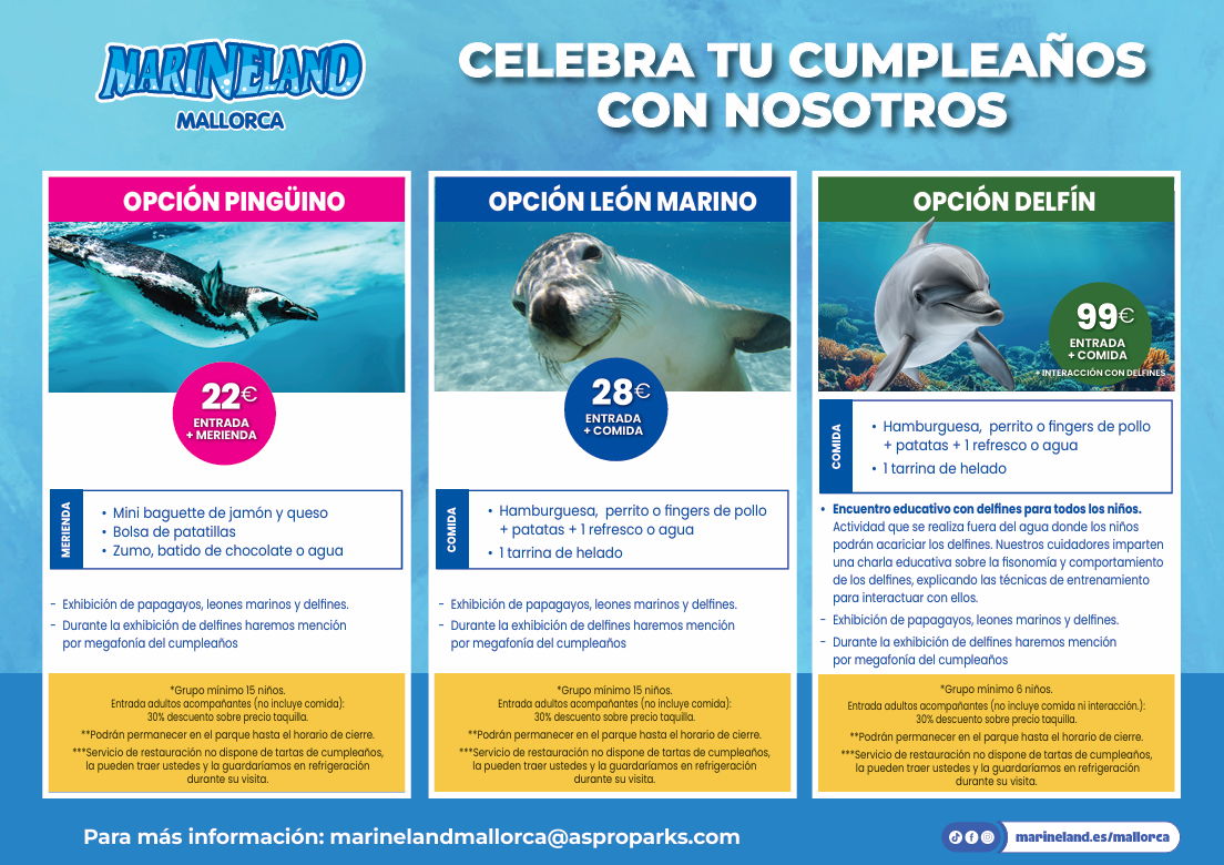 Para más información al respecto y consultar la información más ampliada y detallada, por favor, pueden enviar un email a través del siguiente formulario Contacto – Marineland Mallorca indicando: fecha de la visita y número aproximado de personas, adultos y niños, que conformen el grupo.